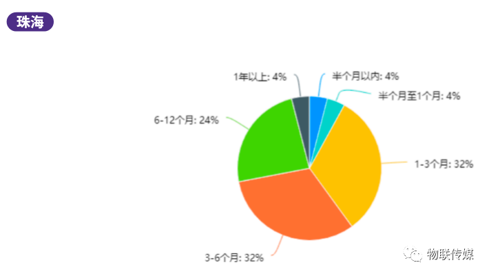 2.珠海市物联网企业资金支持在1个月以内的占比仅8%,并且3个月以内的占比为40%,这两个数据都远低于全国平均水平,此外资金支持在6月以上的企业占比达到了28%,高于全国平均水平将近10个点,这些数据都标明了这个数据显示了珠海市物联网资金比较充裕,抵抗疫情影响的能力比较强。