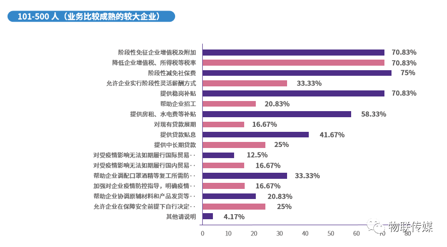 3.101-500人规模的企业对于降低增值税与所得说、减免社保税等减税选项的比例都比较高,此外,这类企业对于贷款的补贴选项期望值也比较高,这类有一定规模的企业对于政策的依赖比较大。