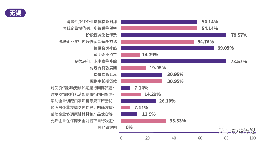 3.无锡市物联网企业最多的三项分别是“阶段性减免社保费”、“提供稳岗补贴”、“提供房租、水电费等补贴”,从这三项对政策期望度来看,主要聚焦于解决企业自身困难,与当下企业面临的痛点密切相关,希冀政府采取实效措施予以支持企业解决燃眉之急。