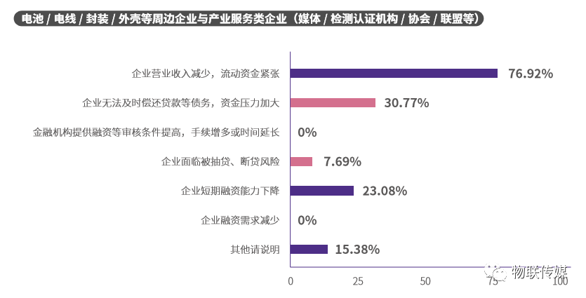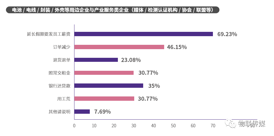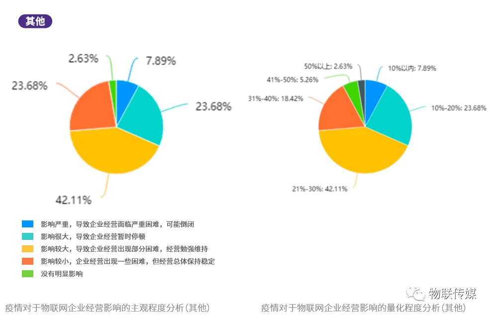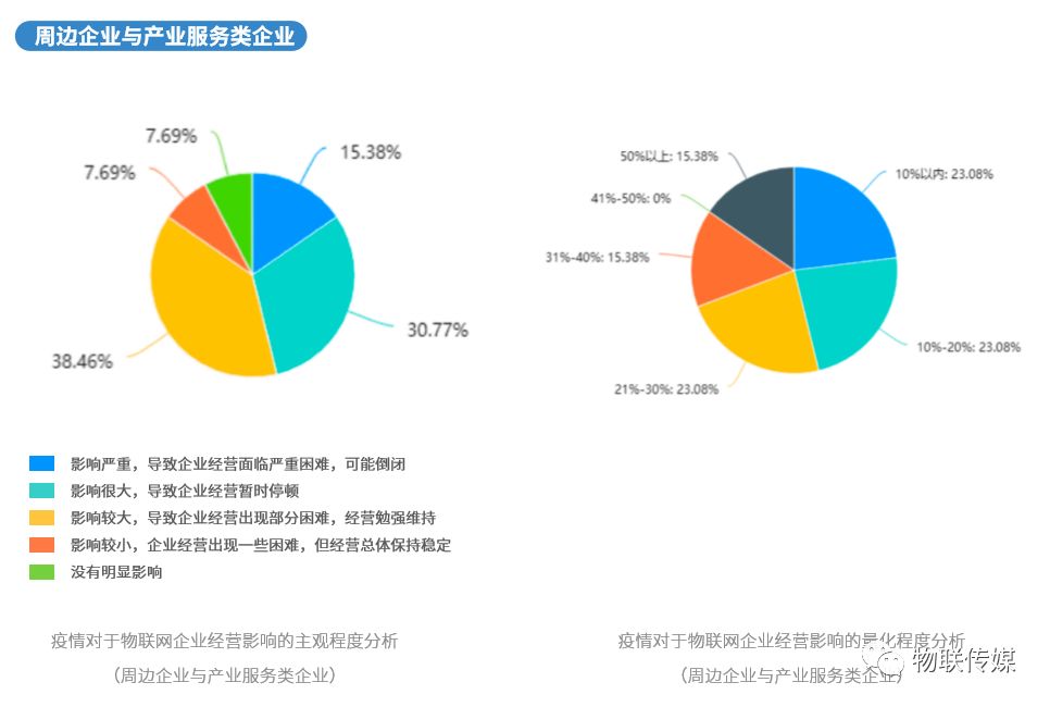 6.物联网产业的辅助与服务类企业受疫情的程度也高于全国平均水平,在这类企业中,认为疫情影响严重与很大的比例也达到了46.15%。疫情对于这类企业的影响也比较严重。
