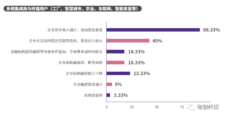 3.系统集成商与终端用户这类企业对于银行还款的压力也比较大,选择这项的比例为35%,高出全产业链平均水平23.12%不少。