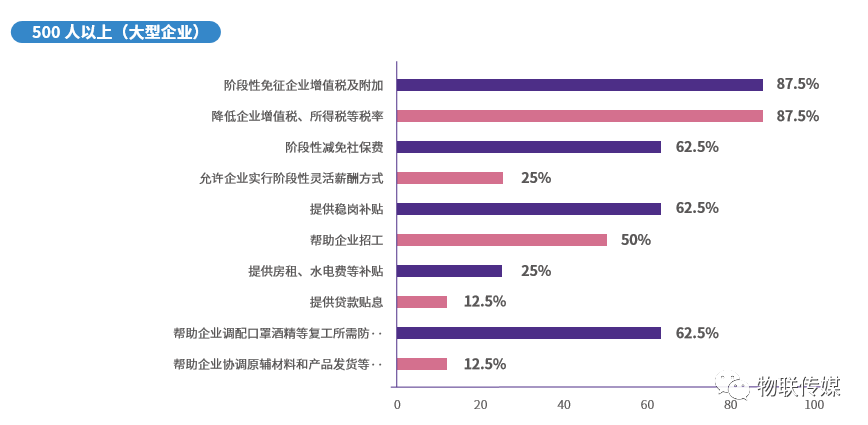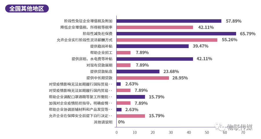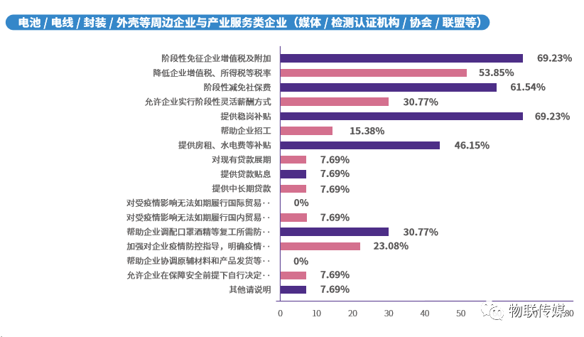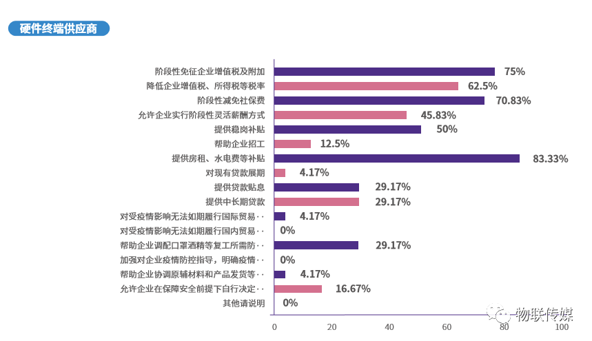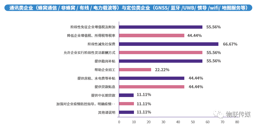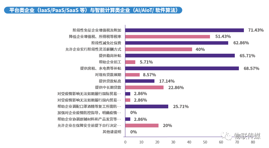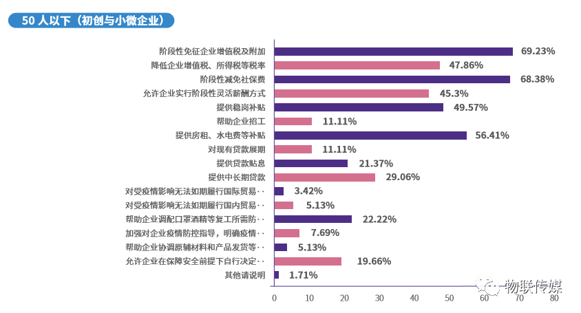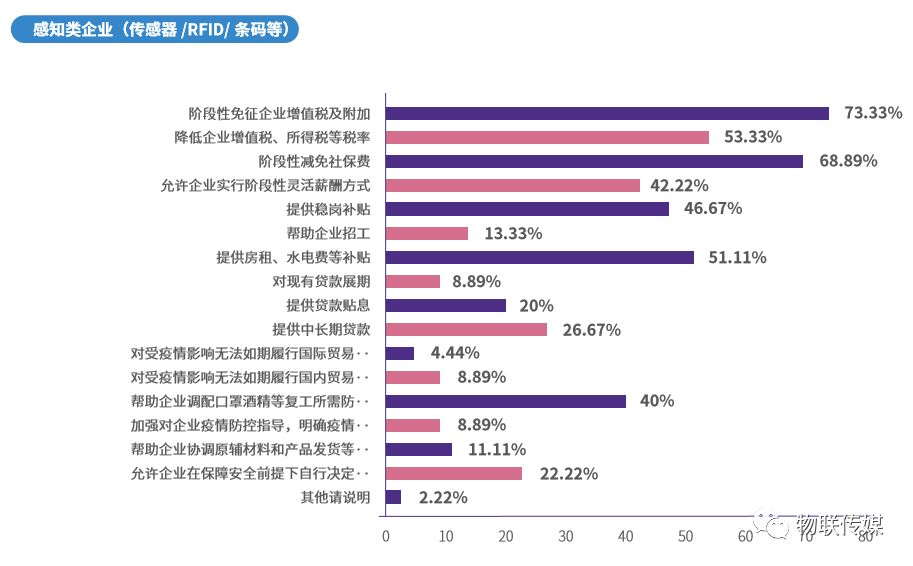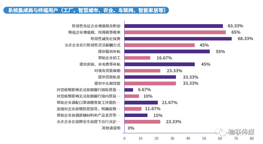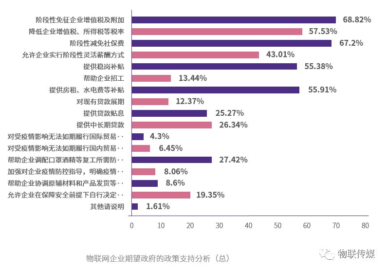 其中,“阶段性免征企业增值税及附加”与“阶段性减免社保费”的选择比例分别达到了68.82%与67.2%。针对这两项的政策扶持将会是物联网企业的帮助最为明显。