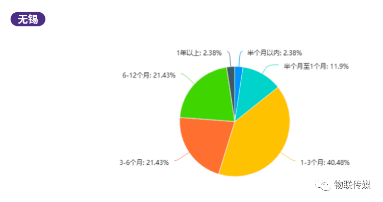 3.无锡市物联网企业的资金表现整体比较贴近全国平均水平,不过在6-12个月这个区间达到了21.43%,明显高于12.37%的全国平均水平,资金比较充足的企业占比比较高。