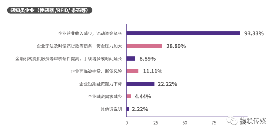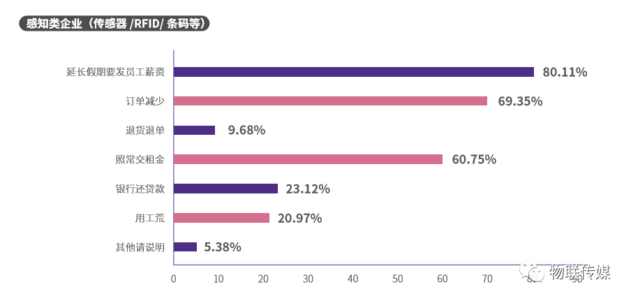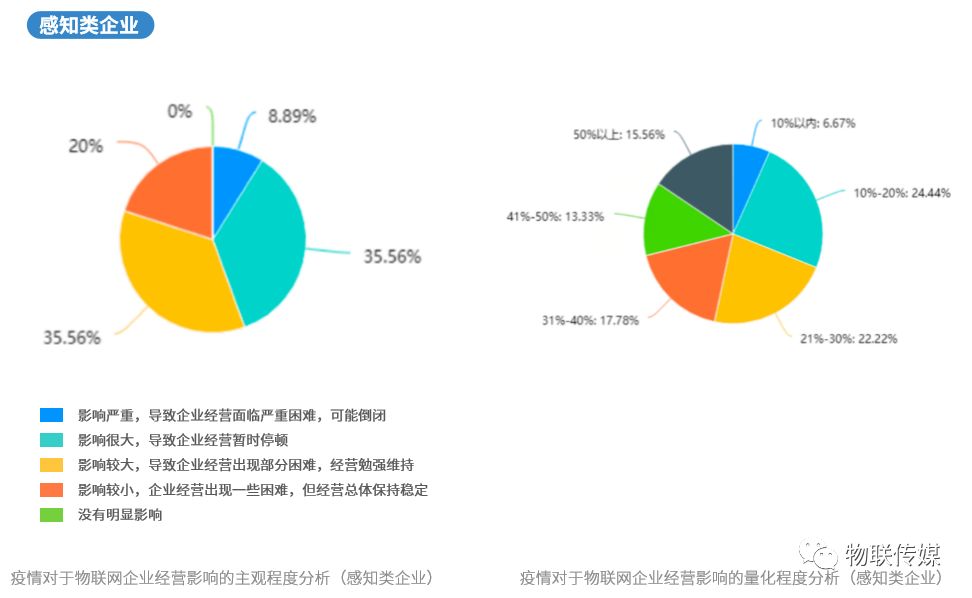 1.感知类的企业选择疫情影响较小(较小或者没有明显影响)的比例为20%,这个数字与全国26.88%的平均水平差距比较明显,说明了感知类企业受疫情的影响比较严重,这与感知类的企业,比如说RFID、传感器企业等企业比较偏重于硬件生产有关。