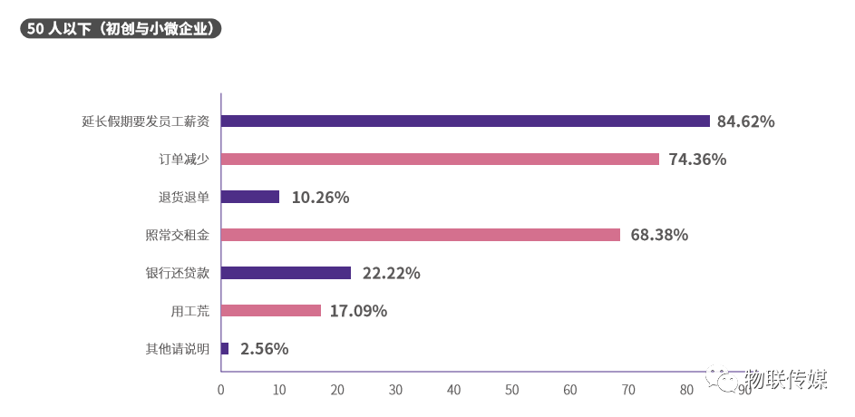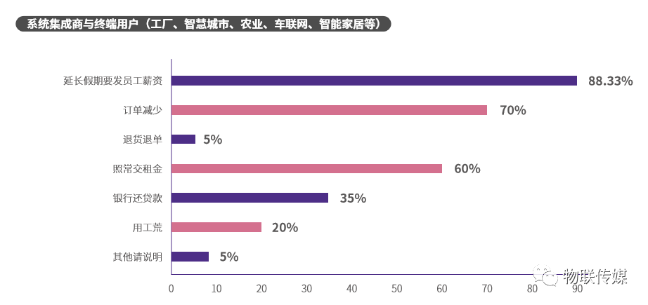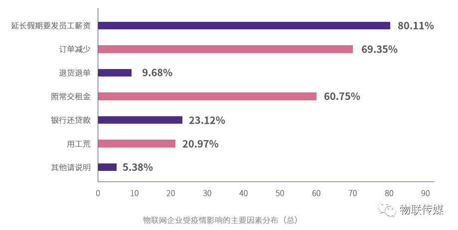 在本次调研中,我们针对疫情对于物联网企业的主要影响因素也进行了统计,疫情对于物联网企业的主要影响因素有:延长假期要发员工薪资、订单减少、退货退单、照常交租金、银行还贷款、用工荒。