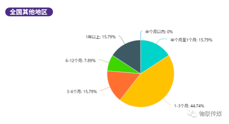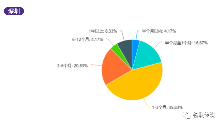 1.深圳市物联网企业的资金支持在1-3月区间占比达到了45.83%,这一比例明显高于全国平均水平,而6个月以上的占比仅有12.5%。由此可见,深圳市的物联网企业受本次疫情的程度比较大。