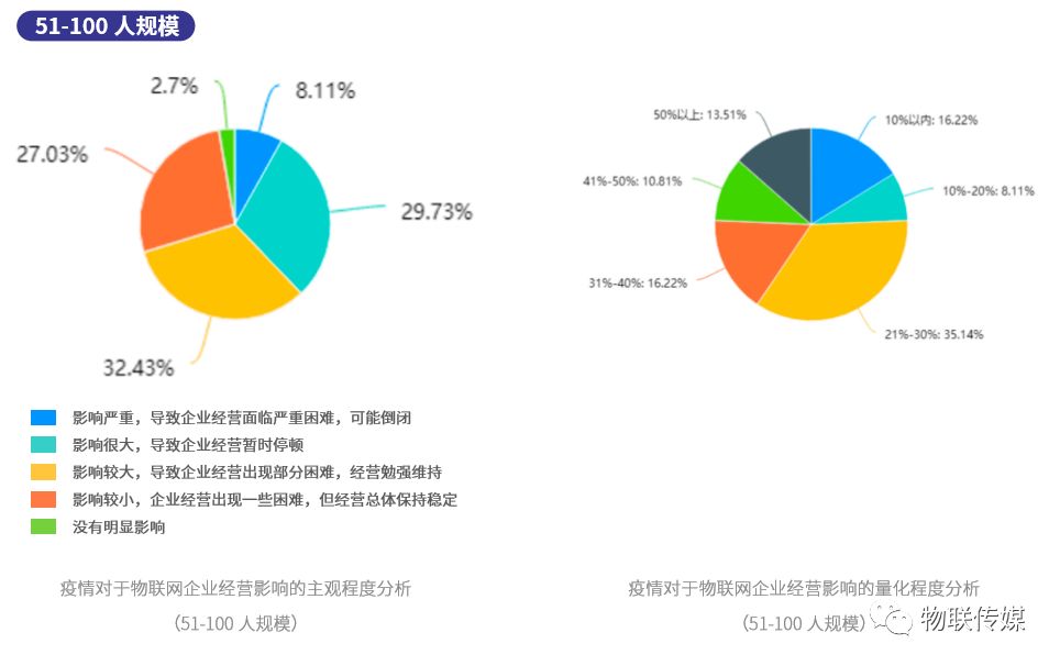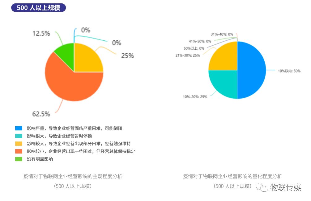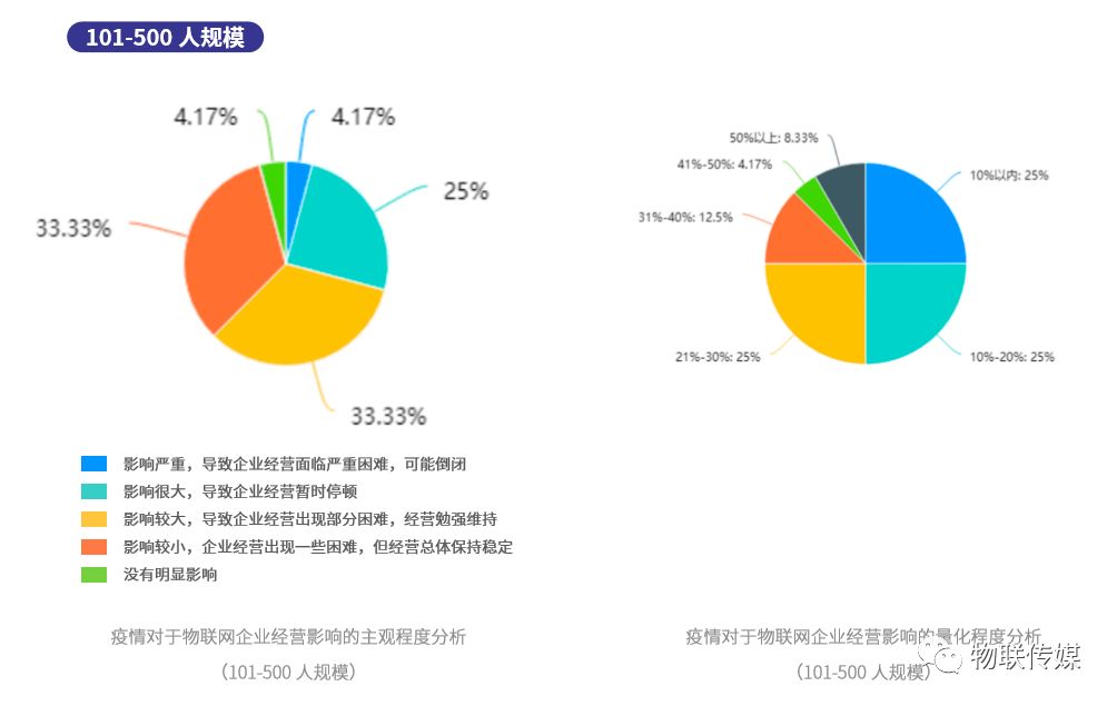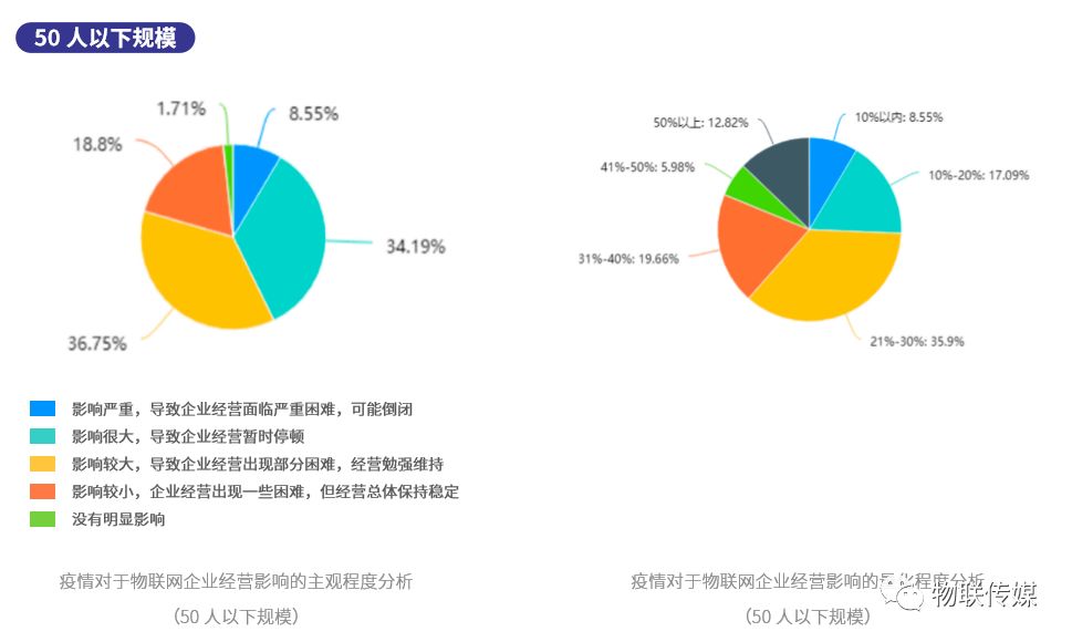 在本次调研中,我们将物联网企业的规模分为了:50人以下(初创与小微企业)、51-100人(初具规模,业务也相对成熟,快速发展期)、101-500人(业务比较成熟的较大企业)、500人以上(大型企业)这几类进行分析,而疫情对于物联网企业的影响程度,我们主要分为两种表现,一种是较大(包括影响较大、影响很大、影响严重);另外一种是较小(影响较小以及没有明显影响)