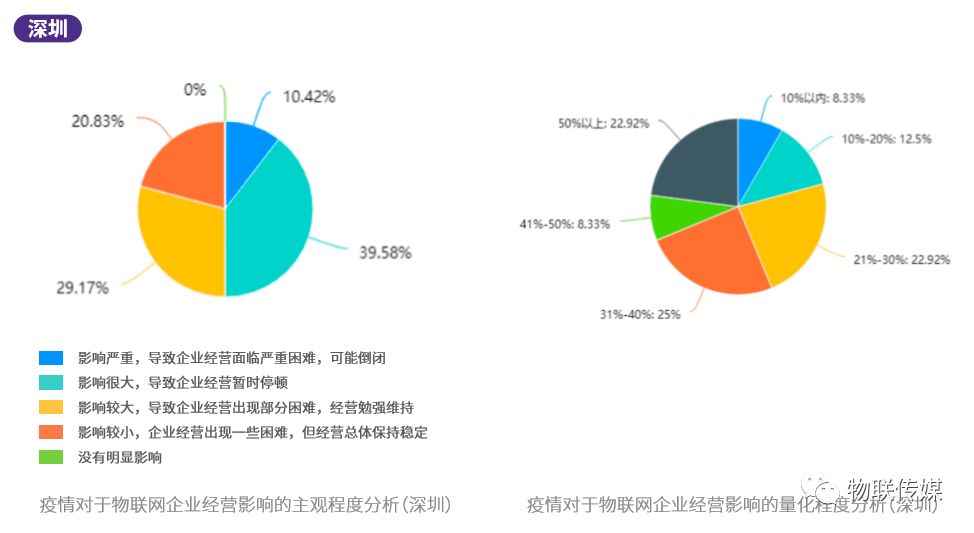 1.深圳市物联网企业选择受影响较小(较小或者没有明显影响)的比例为20.83%,这一比例明显低于全国26.88%的平均水平,这表明,深圳地区的物联网企业在疫情中的影响会比较大。这一数据也在量化分析中得到了佐证,深圳市物联网企业业绩预计损失低于20%的企业占比为正好也为20.83%。