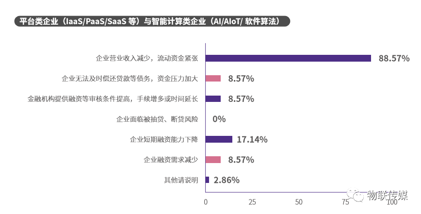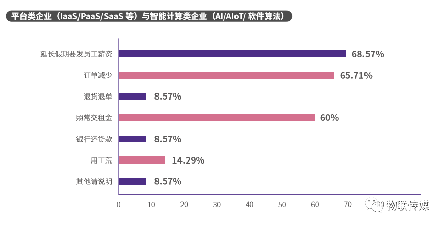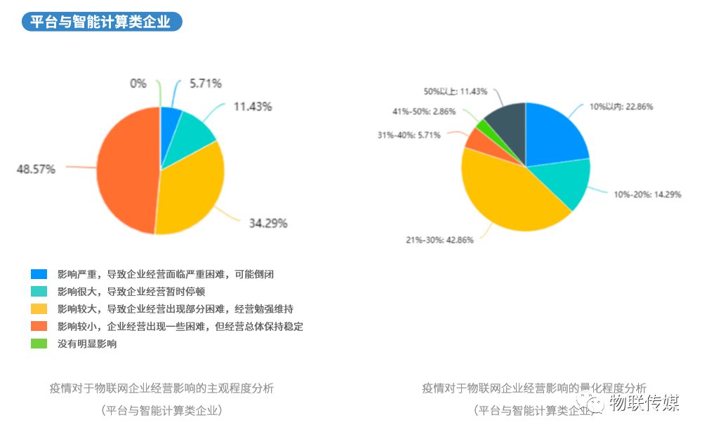 3.平台类与智能计算类企业选择影响较小的比例达到了48.57%,这个数据远远高出了26.88%的全国平均水平,表明了这类企业受疫情影响的程度相对比较小。