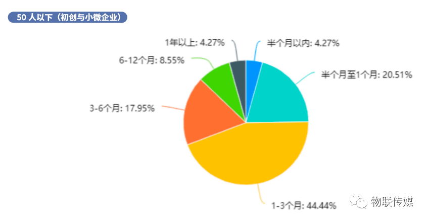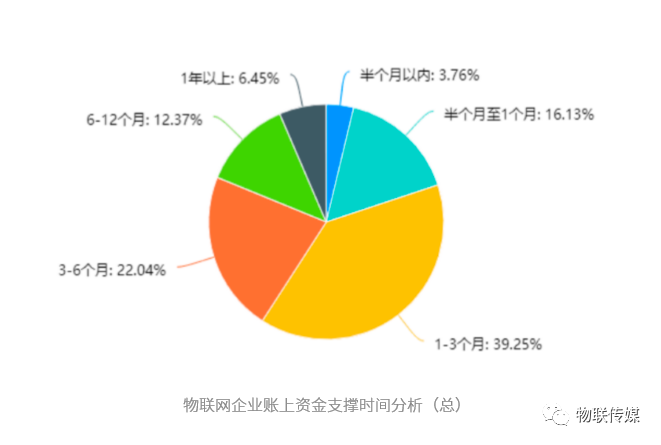 3.整体来说,物联网企业的规模还比较小,现金流充裕的企业(6个月以上)占比不是很多,仅有18.82%。