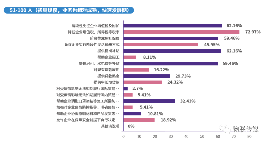 2.51-100人规模的企业对于“降低企业增值税、所得税”的选项达到了72.97%,比平均水平的57.53%高出不少。这方面针对性的政策对于该类企业的帮助会比较大。