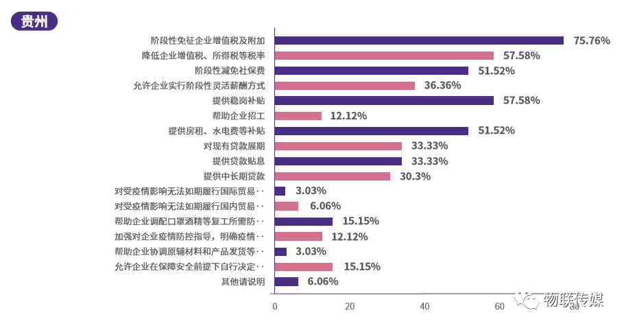 4.贵州省的整体表现与全国平均水平契合度比较高,比较突出的是贵州省物联网企业对于贷款政策扶持期望值比较高,比如说:对现有贷款展期、提供贷款贴息、提供中长期贷款。选择这项选项的比例明显高于全国的平均水平。