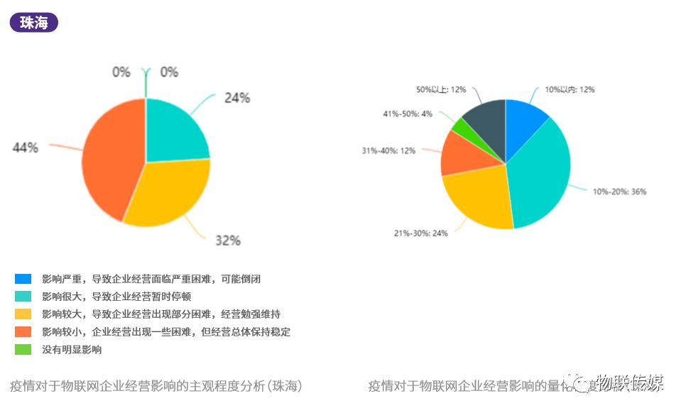 2.珠海市物联网企业受影响程度较小的比例占比为44%,这个数据比全国26.88%的平均水平高出不少,而业绩预计损失在20%以下的企业比例为48%,这些数据说明了珠海市的物联网企业对于疫情的影响预估整体是比较乐观的。