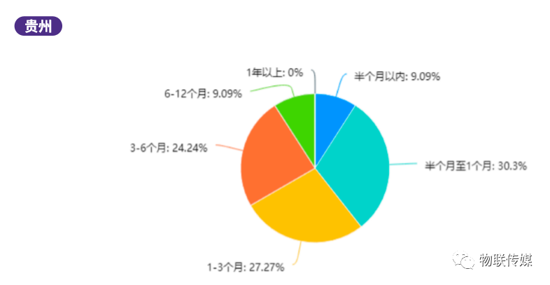 4.贵州省的物联网企业资金支撑时间在3个月以内的比例达到了66.66%,尤其是1个月以内的占比为39.39%。这个数据都明显高出全国平均水平,由此可见,贵州省的物联网企业资金压力是比较大的。
