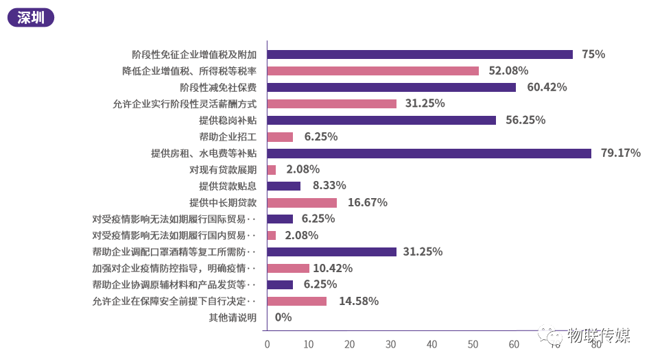 1.深圳市的物联网企业选择“提供房租、水电费等补贴”这个选项的比例达到了79.17%,这与深圳市等一线城市的场地租金高有直接的关系。