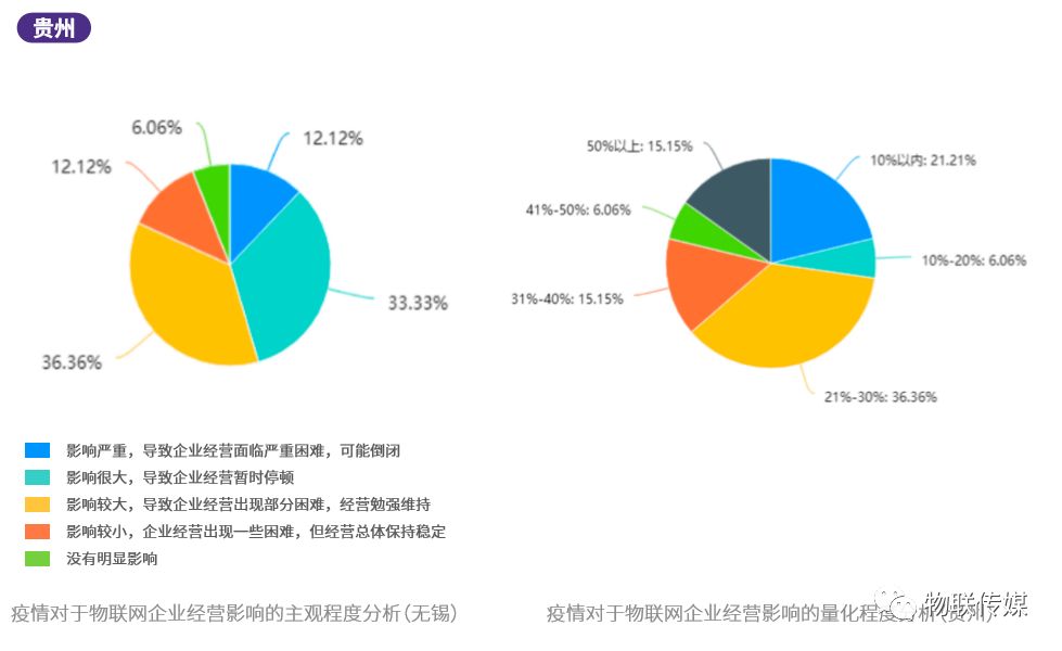 4.贵州省的物联网企业选择影响较小的比例为18.18%,这一比例明显低于全国26.88%的平均水平,尤其是高达12.12%是贵州省物联网企业选择了影响严重这一选项,这一数据远超全国的平均水平。这表明疫情对于贵州省的影响是非常大的。