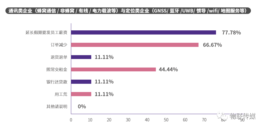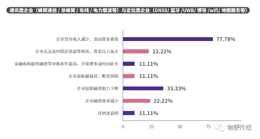 1.通信与定位类企业对于因收入的减少而带来的资金紧张的比例为(76.92%),比全产业链的平均水平(89.25%)低了10多个点,说明了这类企业受疫情影响带来的经营损失相对较小。