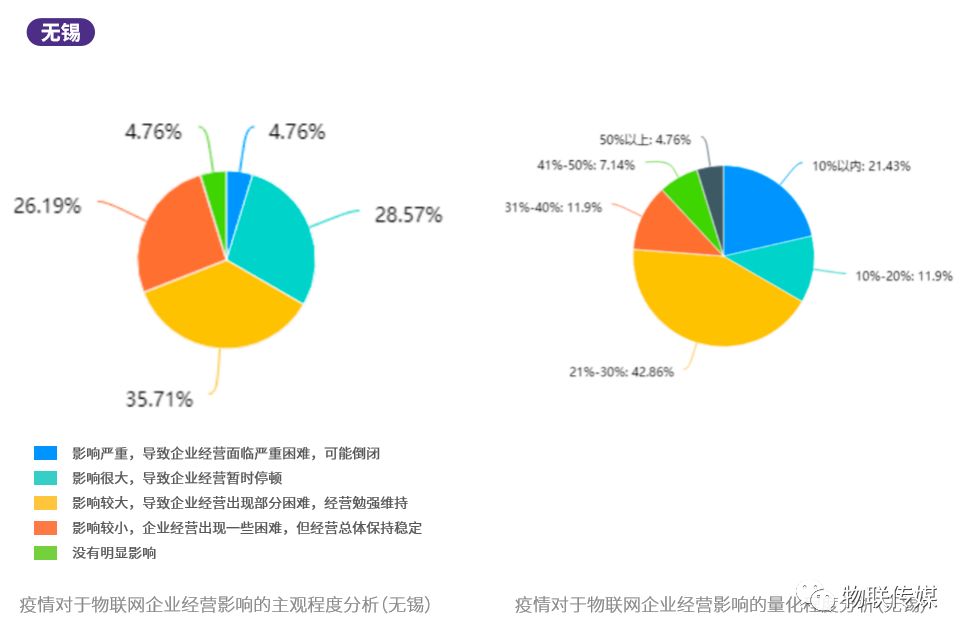 3.无锡市的物联网企业受疫情的影响程度的表现,整体来说,是优于全国平均水平的,认为业绩影响较小的企业占比为30.95,略高出平均水平几个百分点。