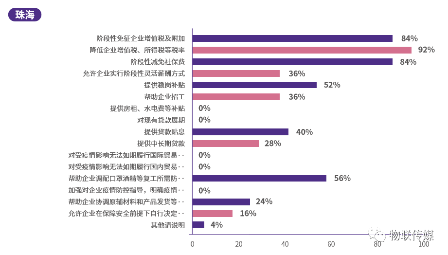 2.珠海市的物联网企业选择“阶段性免征企业增值税及附加”、“降低企业增值税、所得税等税率”、“阶段性减免社保费”这三项的比例都超过了80%,远高于平均水平,珠海市的物联网企业对于政府降低税费的期望值很高。