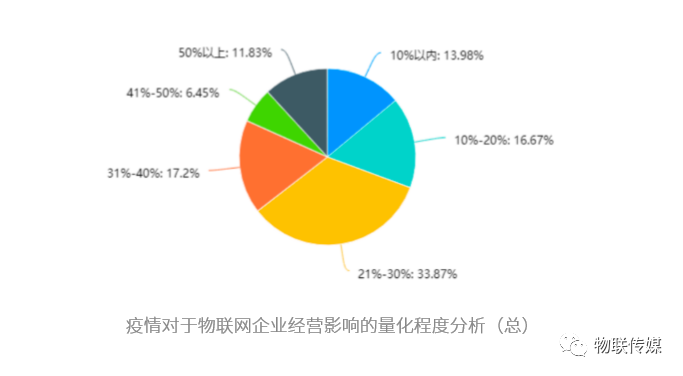 2.在企业因疫情的影响预计受到的业绩损失量化调研中,预计损失为21%-30%区间选择的企业最多,占比为33.87%,以这个区间为中心,业绩损失预计低于这个区间的企业占比为30.65%;业绩损失预计高于这个区间的企业占比为35.48%。基本保持对称,可以预计,今年受疫情的影响,物联网企业的总体业绩损失在21%-30%这个区间内。