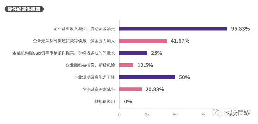 3.硬件终端供应商则在“企业经营收入减少,流动资金紧张”、“企业无法及时偿还贷款”与“企业短期融资能力下降”这三个选项中的比例都高于全产业链平均水平不少,则说明了这类企业现金流比较紧张,同时对于融资、贷款等业务的需求最为明显。