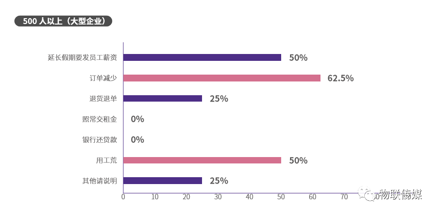 3.500人以上的企业可能因调研的样本比较少,数据有一些失真,但是规模大的企业抗风险的能力越高,这个趋势是很明显的。所以可以总结出,本次疫情对于小企业的考验是非常严峻的。